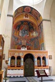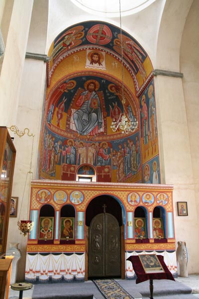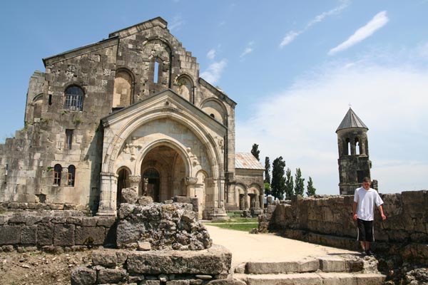 forteresses et en églises. Sans coupole, l'église est une basilique et les clochers sont toujours à coté. A l'intérieur il n'y a pas de bancs pour s'assoir. Un trône repose au centre, c'est le symbole du chef de la Géorgie et de l'Eglise. L'art est épuré et il y a peu de décorations (quelques icônes et peintures ornent les murs) car l'histoire du pays a été marquée par de nombreuses guerres et invasions. Les géorgiens sont orthodoxes en très grande majorité. Ils sont très croyants et pratiquants et l'Eglise joue un grand rôle dans l'éducation aujourd'hui encore. |