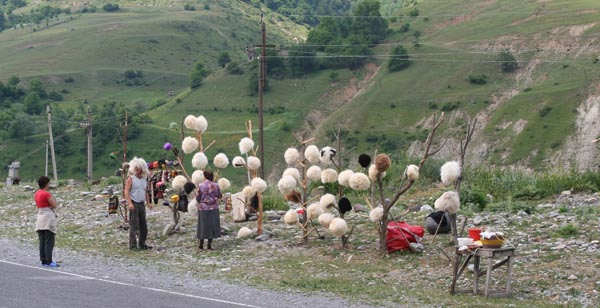 A partir de Goudaouri, station de ski, la route se dégrade nettement et grimpe jusqu'au col de la Croix. Les paysages sont superbes. Nous gagnons Kasbegi, petit village encaissé à 1700 m d'altitude et à 15 kms de la frontière russe. Nous nous installons pour la nuit. Il fait frisquet, nous ne sommes plus habitués à enfiler nos polaires. |