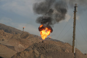 | La route traverse ensuite une zone d'exploitation du gaz. Les flammes gigantesques sont visibles à plus de 20 kms, et quand on arrive à leur hauteur, le bruit de la combustion prend l'ampleur de celui d'un avion à réaction au décollage et on sent la chaleur des flammes. Vraiment impressionnant ! |
