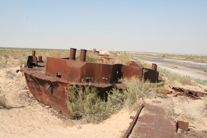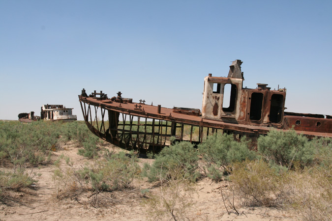 Nous nous dirigeons vers le Nord pour atteindre Moynaq. Autrefois l'un des deux grand port de la Mer d'Aral, cette ville se trouve aujourd'hui à 150 kms de l'eau. Les vestiges de sa flotte de pêche échoués sur le sable et rongés par la rouille sont le témoignage visible d'une des plus grave catastrophe écologique causé par l'homme. Des planificateurs soviétiques décidèrent