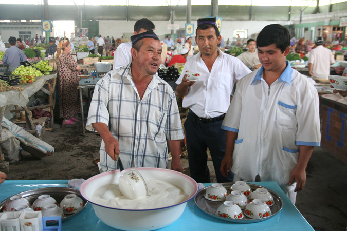 a poser notre campement. La vallée est aussi le centre de la sériculture (culture de la soie) centrasiatique. A Margilan, nous nous rendons à la fabrique de soie Yodgorlik et nous y découvrons les méthodes traditionnelles d'impression des motifs, de tissage, et de broderie. |