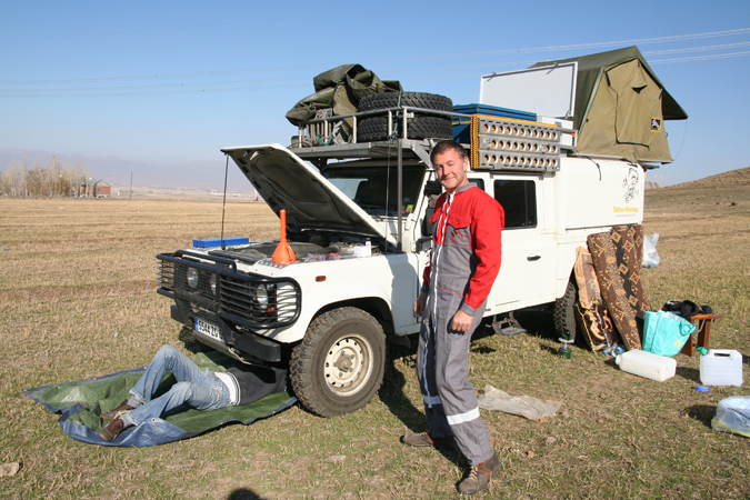 | De retour à notre bivouac proche d'Erzurum, et n'ayant toujours pas de nouvelles de nos visas, Phil et Tom en profitent pour faire la vidange de Boomerang et essaient de trouver d'où vient la fuite de liquide de refroidissement que nous avons observé depuis quelques jours déjà. |
